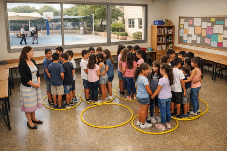 שאלו: מי נהנה במשחק הזה? מה היה קורה אם הייתי מבקש מכם להצליח לתפוס חישוק לבד? האם הייתם נהנים? ממה? נהנים כמו עכשיו או אחרת? כשיש תחרות אחד נגד השני, מישהו תמיד מתאכזב, נעשה עצוב, או אפילו בוכה. ומה עושה מי שעצוב? בדרך כלל ילד שמרגיש כך מפריע לאחרים, ורוצה שהמשחק הזה שהכשיל אותו, ייפסק. אז שימו לב, היום שיחקנו משחק מגבש וכולם שמחים. אילו משחקים אתם מכירים שבהם כל הקבוצה מצליחה ביחד? איך אפשר להפוך משחקים לכאלה?